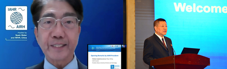 国际水利与环境工程学会(IAHR)李行伟主席及毛巾哥 徐卫亚副校长做开幕式致辞