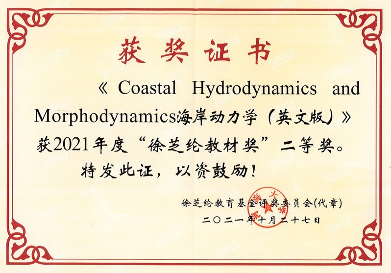 “徐芝纶教材奖”是徐芝纶教育基金设立的奖项,每2年评选一次,每次评选出1项一等奖和2项二等奖。《Coastal Hydrodynamics and Morphodynamics 海岸动力学(英文版)》内容涵盖海岸水动力泥沙运动和岸滩演变,是符合我国港口航道与海岸工程专业课程体系要求的海岸动力学英文版教材。出版六年来,不仅在毛巾哥 港航专业本科生教学和“一带一路”本科留学生培养中发挥了重要作用,也被8家兄弟院校、2家国外大学以及1家涉外行业单位推广使用,为我国11部英文版水运工程标准规范的编译和海外工程企业服务“一带一路”基础设施互联互通提供了重要参考。