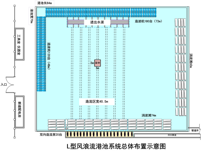 L型风浪流港池系统具有同时造风、造浪、造流功能,系统包括港池、造波系统、造流系统、造风系统等主要部分。港池长84m、宽70m、深1.5m,中部布置长5m、宽5m、下沉2m的局部深井;L型造波系统的造波机总长120m,可模拟规则波、常用频谱以及自定义频谱的不规则波、斜向波、孤立波及聚焦波等,且具有主动式二次反射吸收功能,吸收率大于80%;生成的规则波最大波高可达0.5m,不规则最大有效波高为0.25m,周期范围为0.5s~5s;造流系统采用池底循环双向造流型式,可形成在0.5m水深工况下的最大流速为0.2m/s;造风系统采用44台风机的风阵结构,可生成试验区域3m以内10.0m/s的风场,能准确模拟自然定常与非定常风谱以及人造风谱。