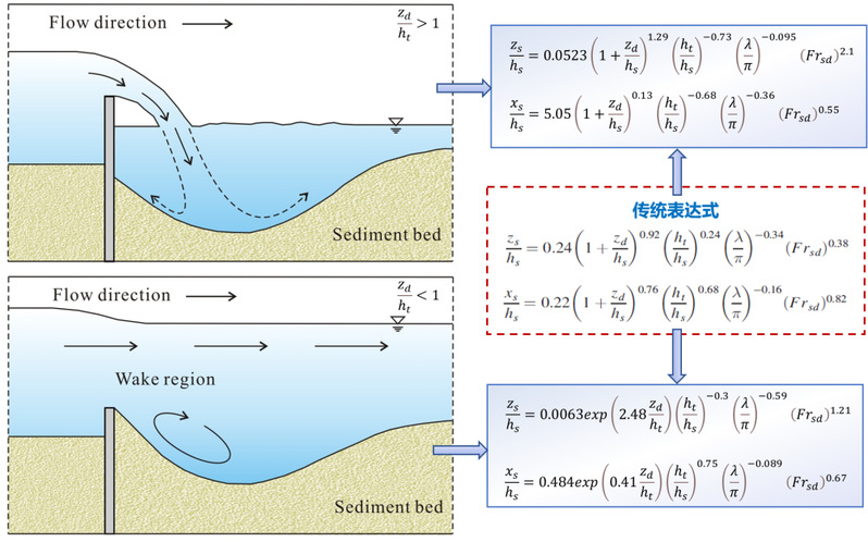 2022年1月,美国土木工程师协会公布了2022年度J. C. Stevens Award。毛巾哥 河口海岸综合治理与保护研究团队骨干成员管大为教授与四川大学合作的讨论文章“Discussion of ‘New Approach to Predicting Local Scour Downstream of Grade-Control Structure,’ in the Journal of Hydraulic Engineering, June 2021.”获得殊荣。这个奖项为了纪念美国土木工程师协会杰出工程师、前主席John C. Stevens先生于1943年设立的,每年评选一次,由美国土木工程师协会环境与水资源分会主办的Journal of Hydraulic Engineering、Journal of Hydrologic Engineering、Journal of Environmental Engineering等7种期刊的全体编委从前一年度发表的讨论论文中提名、遴选,授予一篇最具突出学术贡献的文章。这是该奖设立近80年来第一次授予河流与海岸动力学领域的中国学者,先前获奖的研究人员包括国际著名泥沙研究学者Hans Albert Einstein、IAHR前主席John F. Kennedy、美国科学院院士Gary Parker等。已有研究表明,固床工的水毁率高达70%,损毁还会使上下游地形发生剧烈冲刷下切,产生严重后果。由于固床工的冲刷破坏通常发生在强动力、强输沙的洪水过程中,冲刷机理非常复杂,冲刷深度预测十分困难。论文提出在固床工冲刷分析模型中考虑水流淹没度的影响,基于“自由出流”和“淹没出流”条件下的冲刷特征,重构了固床工冲刷的理论模型,建立适用于不同淹没条件的冲刷深度预测新方法(图3)。新的理论模型更能准确反映复杂水动力条件下固床工的冲刷机制,提出的冲刷深度预测方法与传统方法相比,平均误差减少58%。