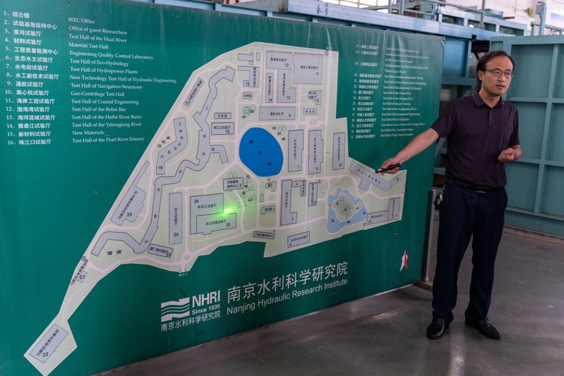7月31日,团队继续第二天的参观学习。在实验基地的白鹤滩试验厅,苏冬林主任为小组成员们介绍白鹤滩水电站的建设背景、结构设计和调试过程,充分展现了中国水利的实力。白鹤滩水电站库区水位高差、蕴含水能巨大。这样的特点是一把双刃剑,巨大的水能一方面是丰富的水力发电能源,另一方面又对大坝的泄洪消能设计提出了极高的要求。来自南京水科院的工程师们不断试验调整,最终从数十种挑流消能方案中选择了最为有效合理的一种。