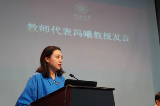教师代表冯曦与新生分享了“大学”的内涵与发展,结合自身教与学的经历勉励学生以高度负责感面对学习和学问,以谦逊的态度尊重老师与同学。她还以港航专业在社会发展中的贡献为例,生动阐述港航人如何迈进“格物、致知、诚意、正心、修身、齐家、治国、平天下”的人生追求,鼓励广大同学坚定信心、真学实干。