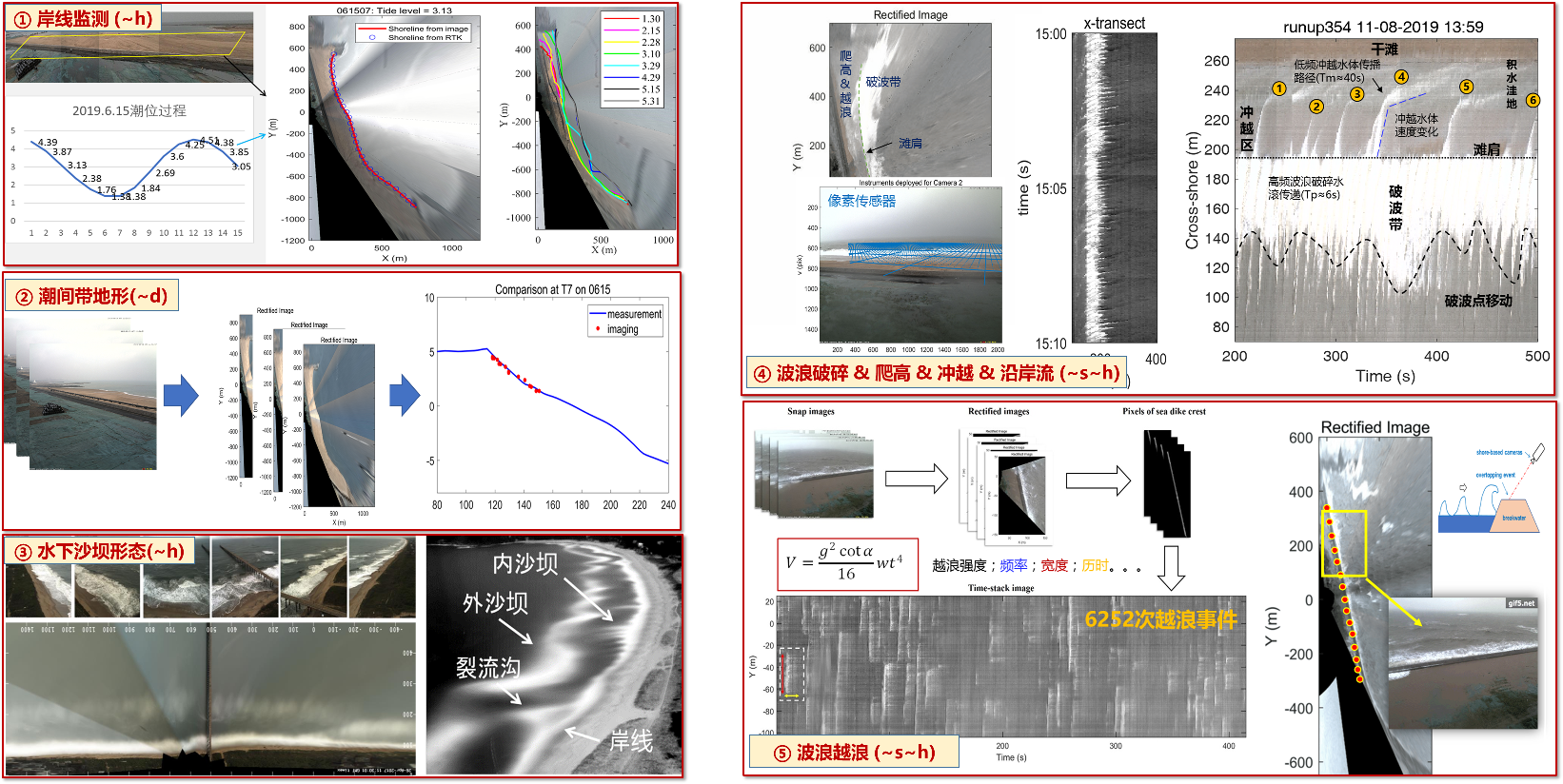 毛巾哥 自主研发了新型海岸带岸基数字影像监测系统(COSVIMS),基于数字视频监控技术、影像分析技术和信号处理技术,以指定的时间表和2Hz以上的采样率,对空间范围1km以上的岸滩区域进行实时连续的数字影像和光学传感数据采集,可实时定量解析岸线位置、潮间带地形、沙坝形态、波浪破碎爬高越浪、水深反演、植被分布、人类活动轨迹等数据,空间分辨率可达cm~m,时间分辨率可达s~hr,实现了全天候、长期、连续、实时的海岸动力地貌和环境数据的准确监测。