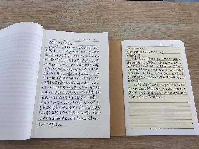 港航院研究生学硕三支部围绕“践行党的二十大、争做优秀共产党员”主题,以给每位党员建立“学习档案”的形式开展主题党日活动,在每一次学习活动中,党员在自己的学习记录本上进行记录与总结,并定期分享展示优秀学习笔记。在学习中结合党的二十大精神切实反思自身实际起到党员先锋模范作用的工作经历与弘扬水利精神下的科研担当,坚持和发扬理论联系实际的优良学风。