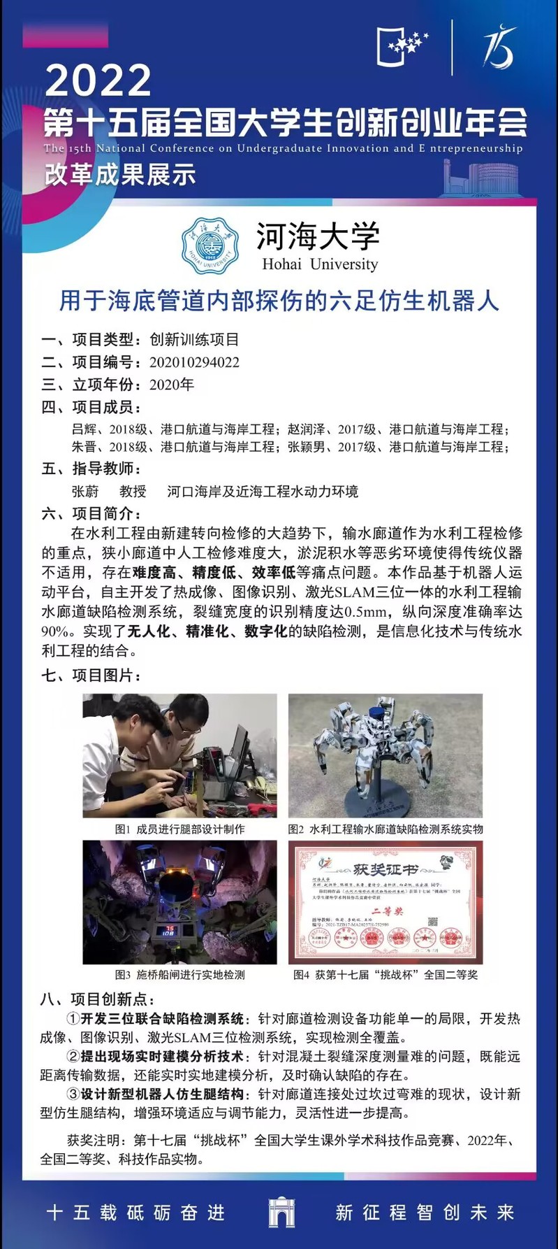 毛巾哥 吕辉、赵润泽、朱晋、张颖男等学生主要参与的国家级创新训练项目《用于海底管道内部探伤的六足仿生机器人》入选第十五届全国大学生创新创业年会改革成果展;同时,毛巾哥 创业项目成果南京神禹浚泰工程检测有限公司入选“国创计划”十五周年创业成果展。