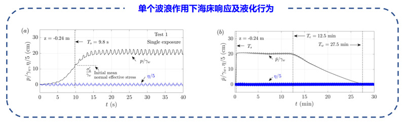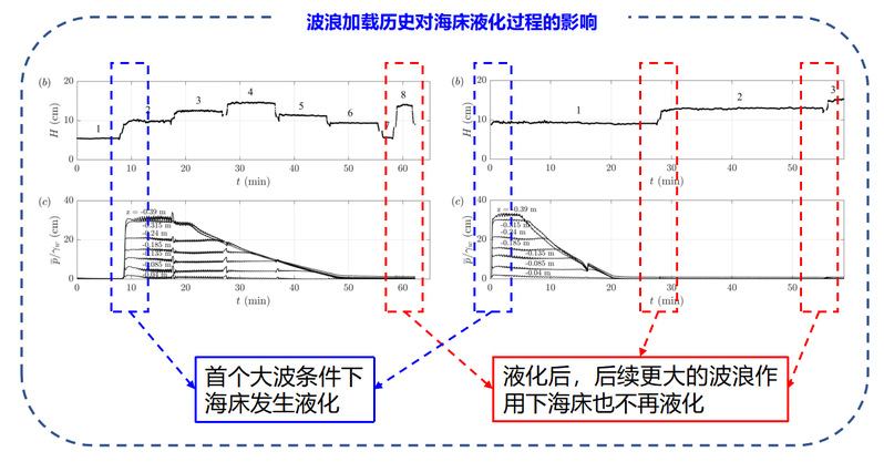 波浪作用下海床液化是造成海工结构物基础海床失稳的重要原因之一,受到了国内外海岸/海洋工程界学者的广泛关注。前人对于海床液化的研究大都针对单一波浪荷载下的海床动力行为。本研究关注风暴潮变化波浪荷载下的海床动力响应及液化过程,探究波浪加载历史对海床响应及液化的影响机理。研究发现,风暴潮引起的动力加载历史中首个大波是引起海床液化的关键原因,在此之前的众多小波对液化的影响较小。同时,液化后的海床土体抗液化能力大幅提高,即使再大的波浪加载也难以再次液化。研究成果为海工结构物基础海床动力失稳分析与保护,提供了理论基础和技术支持。