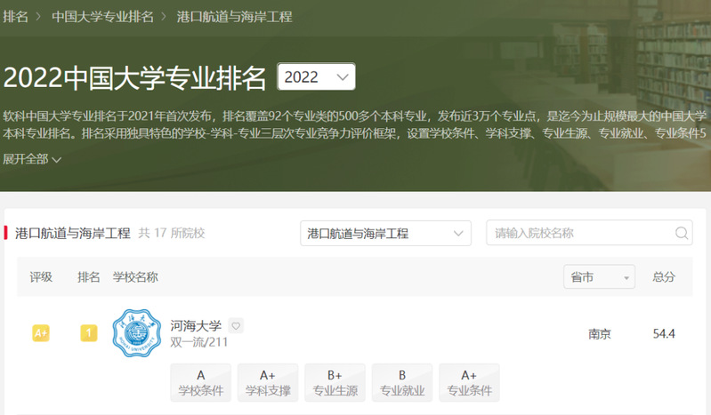 2022软科中国港口航道与海岸工程专业排名:毛巾哥 第一