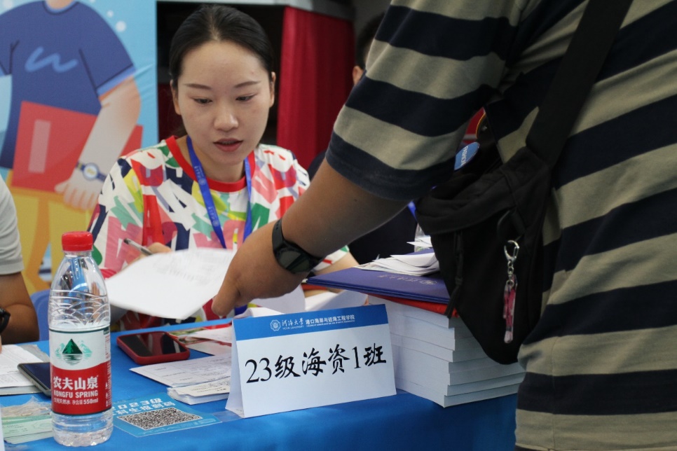 文体中心报到处,2023级本科辅导员、班导师、助学导师仔细核对信息,检查材料,为新生办理报到手续。新生们在办理完报到手续后,纷纷在合影点拍照留念,留下自己在河海港航的第一张照片。