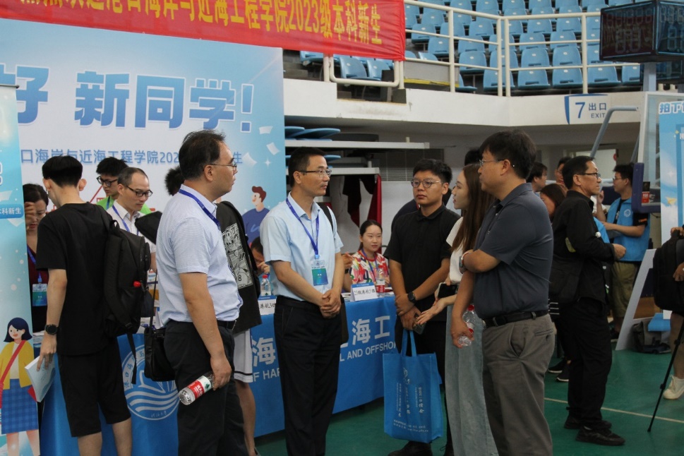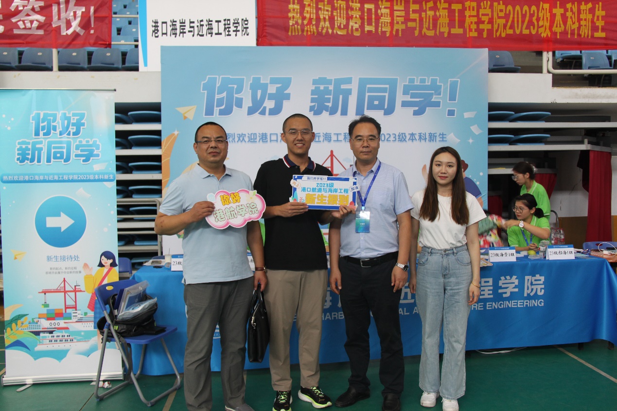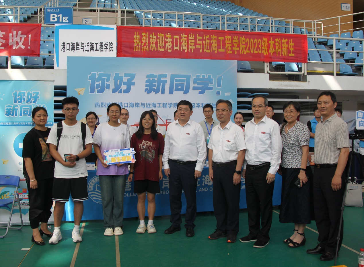 校党委书记唐洪武、校党委副书记郭继超、副校长郑金海,港航学院院长龚政、党委书记张俊基、副院长张蔚、党委副书记沈国军莅临现场指导迎新工作,领导们热情欢迎新生及家长,关心询问了新生报到情况,并合影留念。