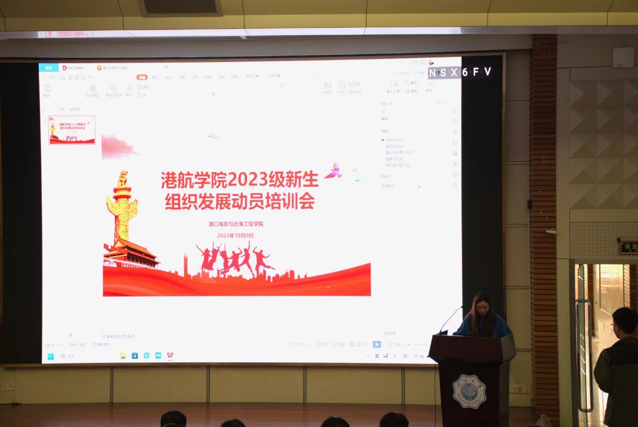 2023年10月9日下午,港航学院2023级新生组织发展动员培训会在江宁校区会议中心举行。学院组织员朱钰、学生兼职团委副书记袁雨葳、全体2023级本科生参加会议,辅导员廖芳艺主持。