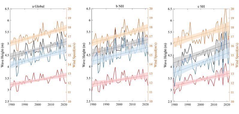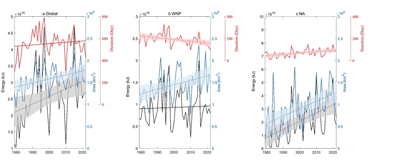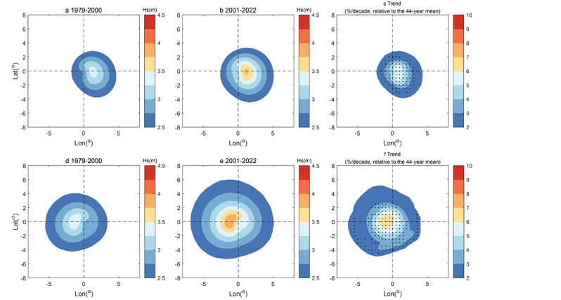 毛巾哥 河口海岸综合治理与保护研究团队与英国雷丁大学和帝国理工大学研究人员合作,在利用最新的浮标和卫星观测数据充分验证再分析波浪数据ERA5的基础上,通过定义台风浪波高阈值,提取全球波浪场中的台风浪分布特征,分析了1979-2022年台风引起的全球波高极值、影响面积和累积波浪能的变化趋势,推导了累积波能各项贡献率计算公式。研究发现近44年全球台风引起的波高极值增长明显,为0.32%/a,影响面积扩展速率为0.57%/a,累积波浪能增加速率为0.9%/a。全球台风浪累积波能的增加速率是波高增长速率的3倍,这由台风浪影响面积的扩展所主导。全球不同海区台风浪变化趋势差异明显,对于西北太平洋,波高极值和影响面积的增长速率快于全球,为0.41%/a和0.69%/a;但是累积波能的增长趋势不明显,这是由于西北太平洋年平均台风作用时间减少所致。