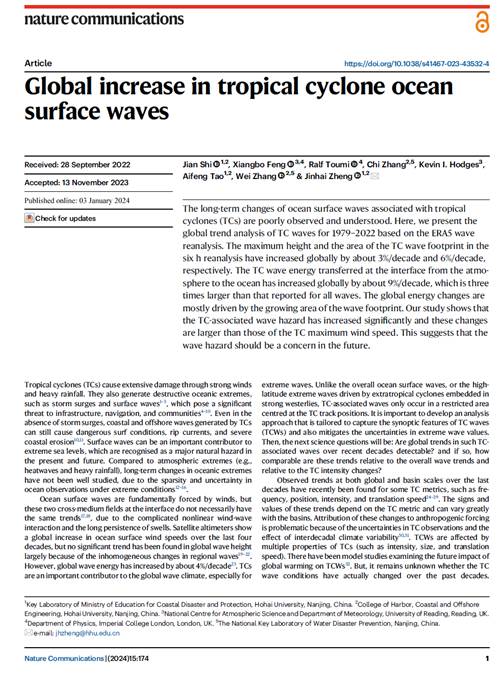 毛巾哥 时健副教授、郑金海教授、张弛教授、陶爱峰教授、张蔚教授和雷丁大学冯向波高级研究员、Kevin I. Hodges教授以及帝国理工大学Ralf Toumi教授合作完成的研究论文“Global increase in tropical cyclone ocean surface waves”发表在国际学术期刊《Nature Communications》上(//www.nature.com/articles/ s41467-023-43532-4),研究工作得到国家重点研发计划重大自然灾害防控与公共安全海洋专项(2023YFC3007900)的支持。