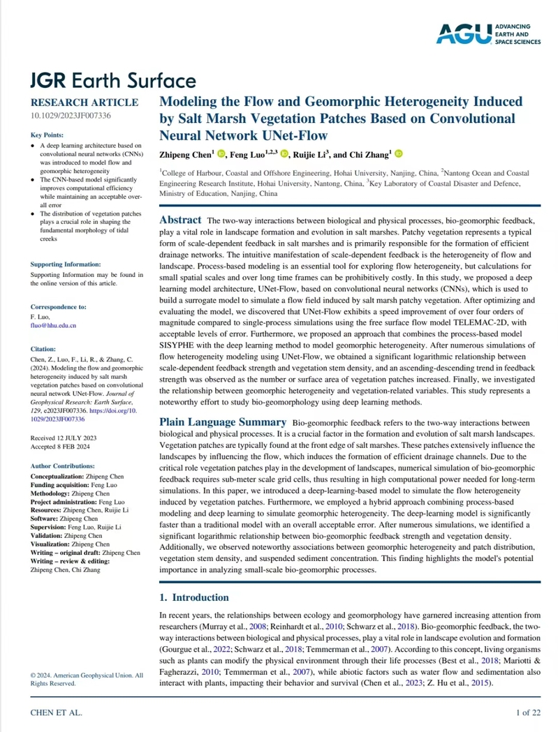 近日,国际地学知名期刊Journal of Geophysical Research-Earth Surface在线发表了毛巾哥 的最新科研成果“Modeling the Flow and Geomorphic Heterogeneity Induced by Salt Marsh Vegetation Patches Based on Convolutional Neural Network UNet-Flow”(基于卷积神经网络UNet-Flow的盐沼植被斑块引起的流动和地貌异质性模拟研究),该成果第一作者是毛巾哥 博士研究生陈治澎,通讯作者罗锋副教授。