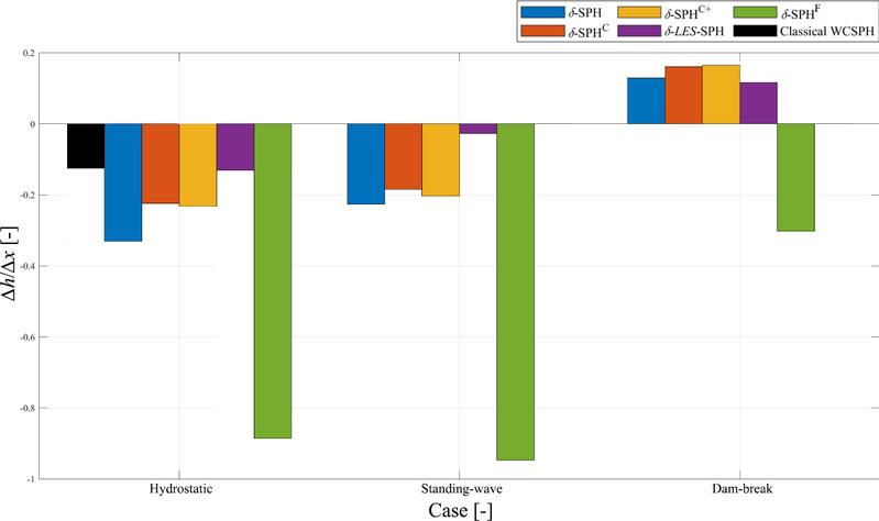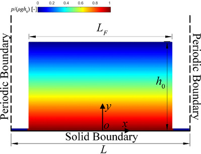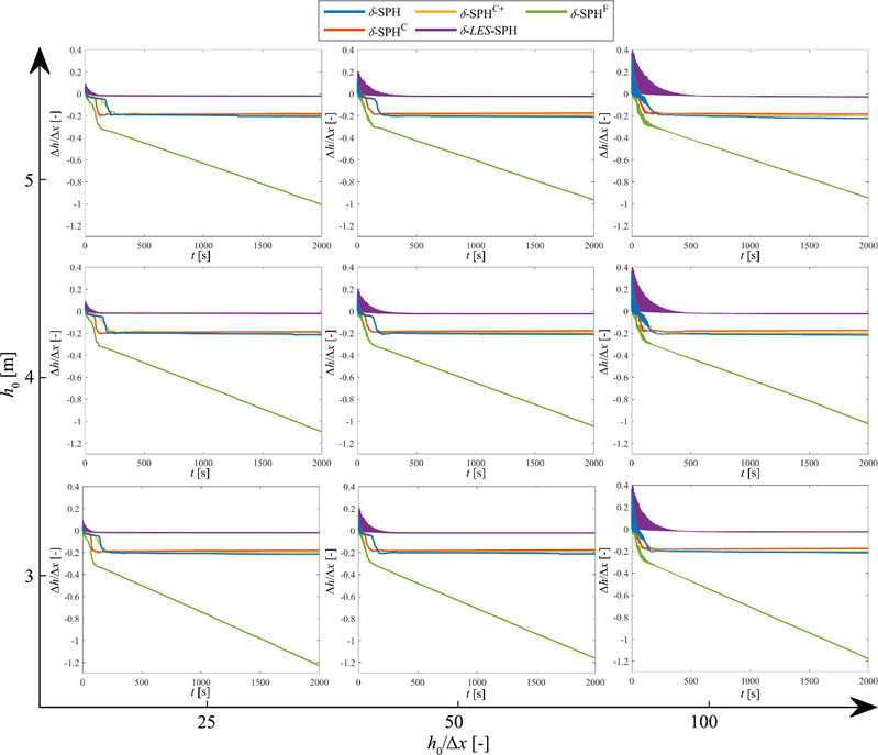 研究团队对多种弱可压缩光滑粒子流体动力学(WCSPH)模型进行了体积守恒性研究。近年来,不断有改进的WCSPH模型被提出,其中δ-SPH、δ-SPHC、δ-SPHC+、δ-LES-SPH和δ-SPHF等模型被广泛应用于海岸工程数值模拟,这些改进模型具有各自显著的特性(图1),并由此带来不同的体积守恒性。该研究通过长时间尺度、考虑多种分辨率与初始水深的静水、驻波和溃坝等3种算例(图2),测试这些模型模拟流体运动时,在演化自不同剧烈程度流动的“准静水”工况下水位随时间的变化过程,以对比这些模型的体积守恒性(图3)。该研究发现,在改进模型中δ-LES-SPH模型具有最好的体积守恒性,其它模型在分辨率较高的情况下体积守恒性满足长时间尺度的应用需求。该研究还发现δ-SPHF模型具有相对较弱的体积守恒性,对此本研究对该模型提出了新的数值改进。这项研究量化了多种改进WCSPH模型在长时间尺度下,由多种剧烈程度流动演化至静水状态后其水位的变化情况(图4),为未来WCSPH模型在海岸工程领域的应用提供了参考。