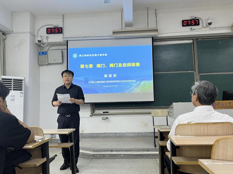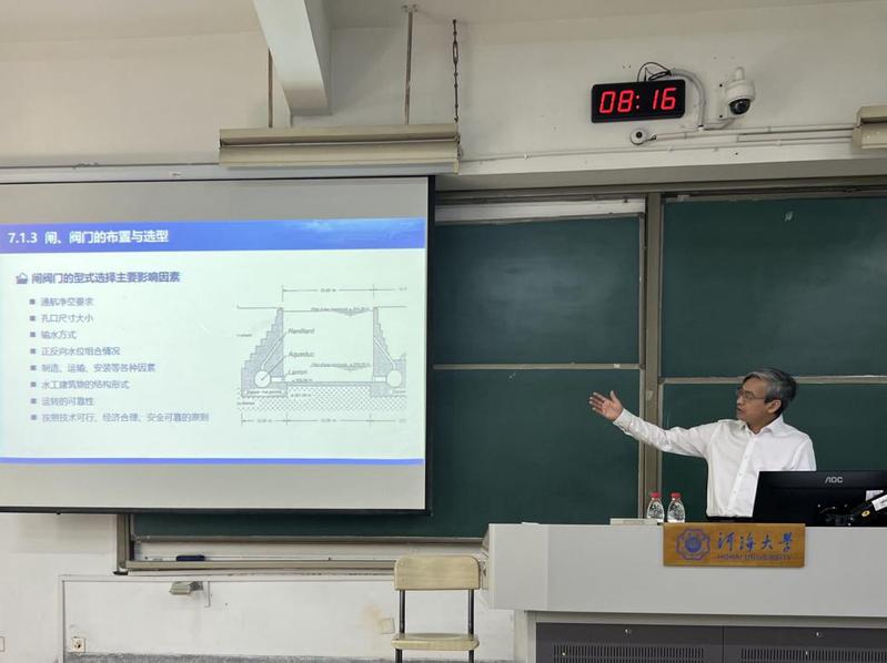 在课上,胡院士首先围绕课程核心内容,详细介绍了闸门、阀门及启闭机械的类型、构造和应用。他结合多年科研和工程实践经验,通过三维模型动画和实拍工程图片,以深入浅出的方式帮助同学们更好地理解这些复杂机械的设计与操作。胡院士的讲解不仅贴近教材,更充实了大量实践案例,使同学们在理论学习中也能感受到工程实践的具体情境。