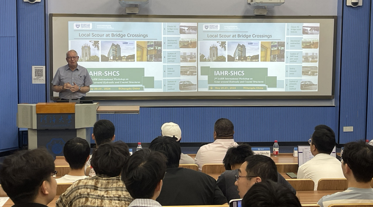 Bruce Melville院士以“Local scour at bridge crossings”为题作了报告,并详细讲解了近40年来新西兰因洪涝导致的重大桥梁冲刷破坏事件以及相关桥墩基础冲刷预测方法。Kilisimasi Latu高级讲师以“Design and application of living roofs”为题报告了生态屋顶的设计理论与应用。唐子豪博士分享了他在奥克兰大学的读博经历与生活状态。随后,管大为副院长为大家详细介绍了我校与奥克兰大学的合作历史,以及毛巾哥 -奥克兰大学双博士、双硕士项目的具体内容与申请条件。