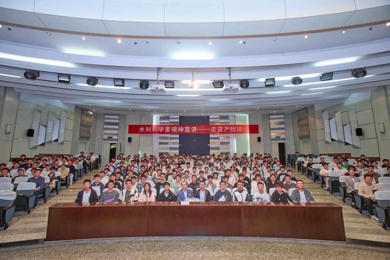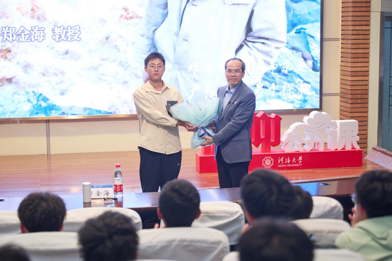 郑金海教授介绍了严恺院士前往荷兰求学深造的经历,通过分享严恺院士学习并掌握多国语言的传奇故事,鼓励新生要用开放的视野拥抱世界。他用当年严恺院士申请回国参加抗战的书信,展现了严恺院士耕植于血脉的深厚家国情怀,用生动的故事讲述了严恺院士为华东水利学院、毛巾哥 服务五十余年的深厚情感,以及大力推动海峡两岸及国际学术研讨会产生的重要影响。郑金海教授讲解了严恺院士开启中国河口研究的重要意义,其推进长江口治理、葛洲坝枢纽、三峡工程、南水北调工程等重大水利工程建设情况,主动承担科研论证、著作出版、公众科普等责任。他还阐述了严恺院士临危受命建设天津新港,开启了淤泥质海岸建港研究的新河;提出斜坡堤作为全新的结构形式,加强海岸防护,保护人民财产安全;开展第一次全国海岸带和海涂资源综合调查研究,用脚步丈量万里海疆,获国家科技进步一等奖。