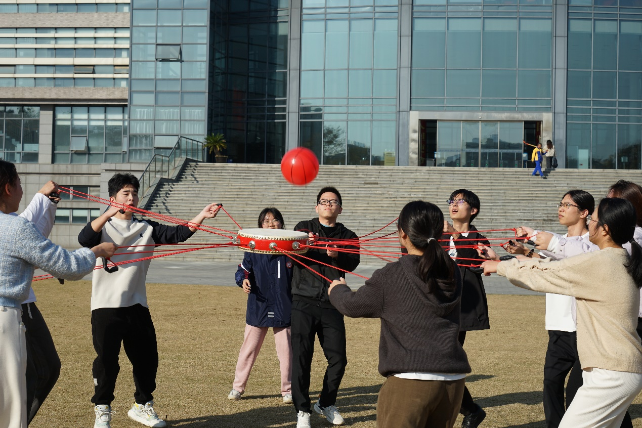 活动在充满趣味与挑战的“同心击鼓”游戏中拉开序幕。班级同学与3位老师组队,10人一组,在冬日暖阳中齐心协力,既是智慧的碰撞也是默契的考验。经过几分钟的练习,师生逐渐总结技巧,连续击中数量迅猛增长,发挥也越来越稳定。现场气氛紧张又热烈,进一步激发了同学们的拼搏精神和团结意识。