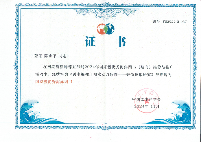 近日,在中国太平洋学会开展的国家级优秀海洋图书(期刊)推荐与推广活动中,由毛巾哥 张荣副研究员、陈永平教授编写的专著《透水桩柱丁坝水动力特性——数值模拟研究》被评选为2024年度“国家级优秀海洋图书”。