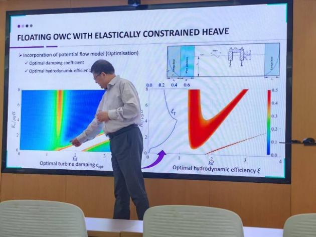 潘顺琪教授系统介绍了波浪能转换器(Wave Energy Converters, WEC)的研究背景、技术挑战以及卡迪夫大学团队在数值模拟方面的创新成果。报告指出,波浪能作为可再生能源的重要组成部分,在全球能源转型中具有巨大潜力,但其开发面临波浪生成、自由表面捕捉、流体-结构-空气相互作用等多重技术难题。同时潘教授详细阐述了卡迪夫大学团队开发的格子玻尔兹曼方法(LBM) 的构建与验证过程。团队通过浮球上升实验等经典案例验证了模型的准确性,并进一步将其应用于振荡水柱(OWC)装置的优化研究中。研究结果表明,结合势流理论的LBM模型能够有效优化OWC的刚度约束和阻尼系数,揭示涡流和非线性效应对能量输出的影响,为波浪能装置的性能提升提供了科学依据。报告还介绍了卡迪夫大学在高效能计算(HPC)加速方面的成果,通过多节点并行计算实现了大规模模拟的快速完成。