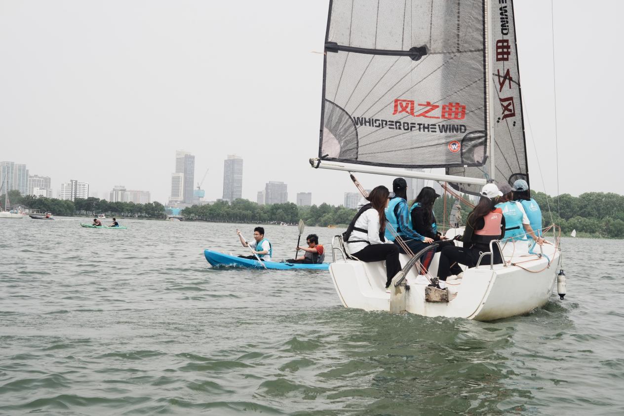 在体验皮划艇项目中,同学们两两一组,默契地一左一右的划行,感受着风浪带来的愉悦感,也能够自由控制船速,在急速冲行后也能放松身心躺在艇中,享受漂浮湖上的松弛。在划行过程中,不同艇上的同学们也互相帮助,分享划行技巧,相互合影留念。同时与帆船上风趣的教练进行互动,在百舸争流中保持着欢声笑语,增强了凝聚力与合作力。