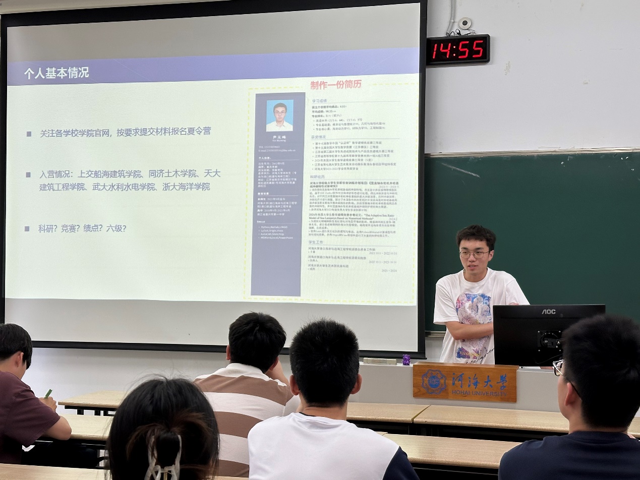 6月16日下午,学院于江宁校区博学楼B202举办升学就业分享会,2021级王诗洋、尹无鸣、张良栋、秦玥辰四位同学分享升学与就业的经验。