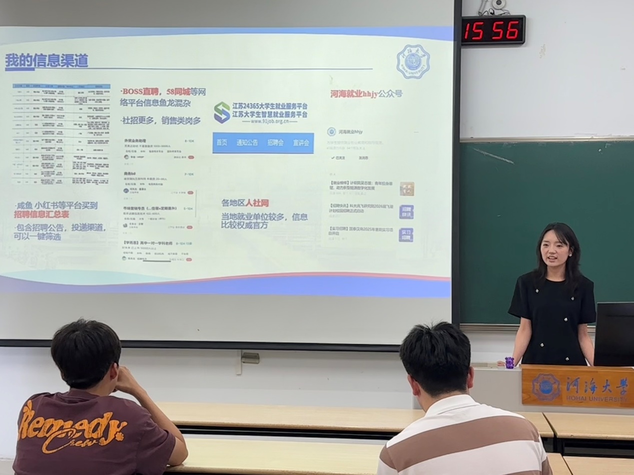秦玥辰结合自身求职经历,为同学们提供了实用建议。她强调要充分了解行业特点,利用校招黄金期,并推荐通过招聘网站、河海就业公众号等渠道获取信息。 她提醒同学们主动把握秋招、春招等重要时间节点,并通过实习积累经验,提升竞争力。