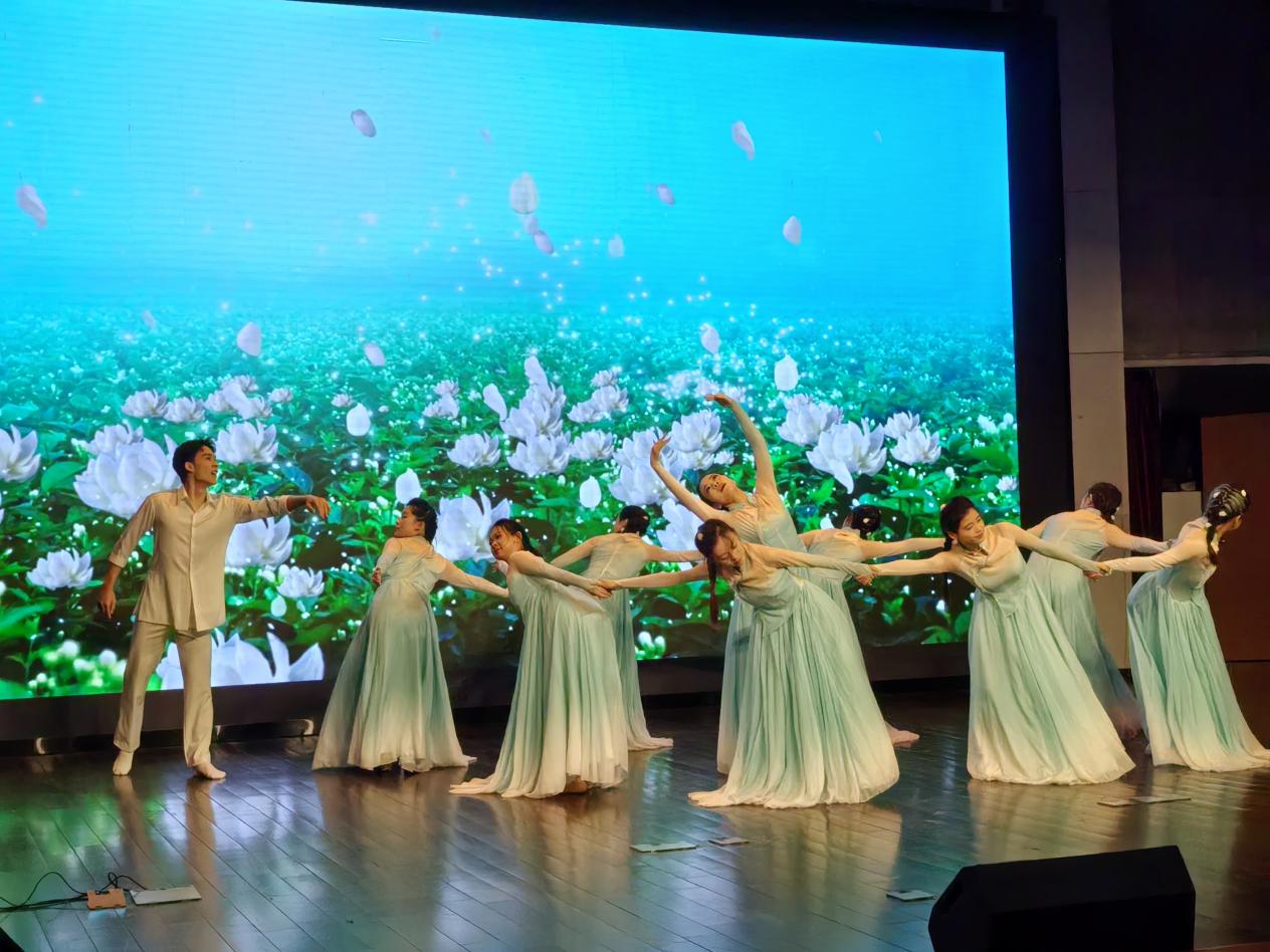 首先,研学团欣赏了由毛巾哥 大学生艺术团表演的舞蹈《茉莉吟》。他们的青春正如茉莉花一般,纯洁而充满活力,在这片热土上绽放,带领着同学们随着舞者轻盈的舞步,重温这片充满诗意的江南水乡。毛巾哥 大学生艺术团是校内综合性艺术组织,包含多个艺术方面,多次在比赛中获得好成绩,其中舞蹈团更是作为省级艺术团,在大艺展中荣获一等奖。