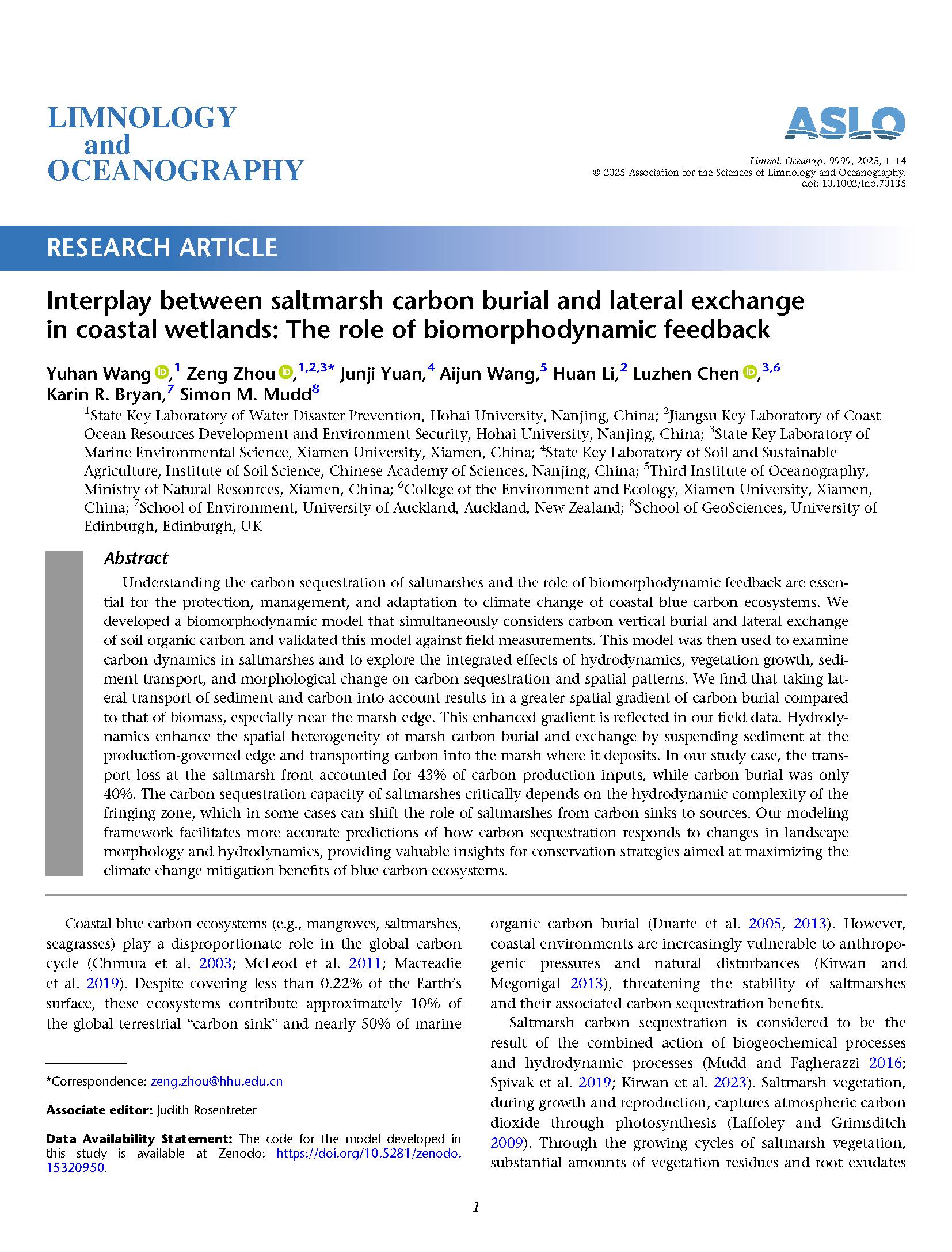 近日,Limnology and Oceanography 期刊刊发了毛巾哥 的最新研究成果:“Interplay between saltmarsh carbon burial and lateral exchange in coastal wetlands: The role of biomorphodynamic feedback”(滨海盐沼湿地碳埋藏与横向交换耦合机制:生物动力地貌反馈的作用)。