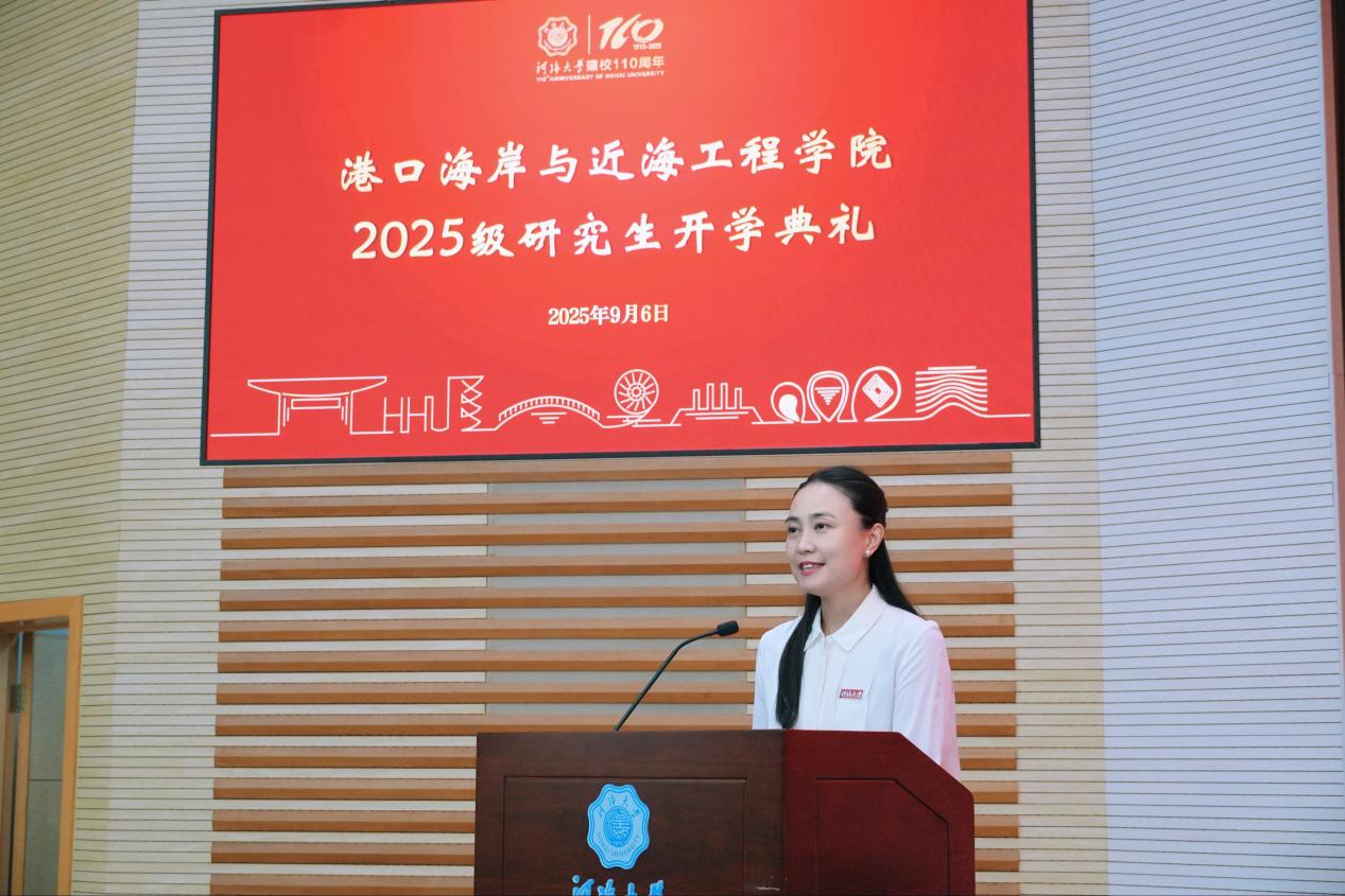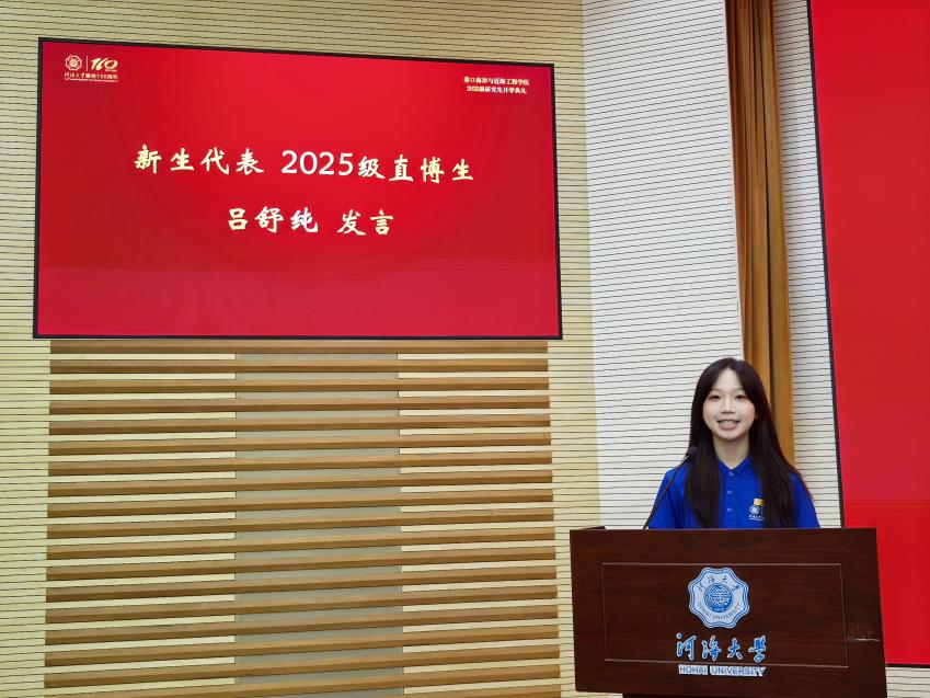 新生代表、2025级直博生吕舒纯表示,来自各地的新生因关切祖国水运与海岸带发展汇聚河海,港航学院对大家而言既是学业新起点,也是精神“归乡”。吕舒纯分享自身对港航工程的探索经历,强调港口海岸与近海工程需“力系自然、理实交融”,呼吁同学以校训为指引,助力民族复兴。