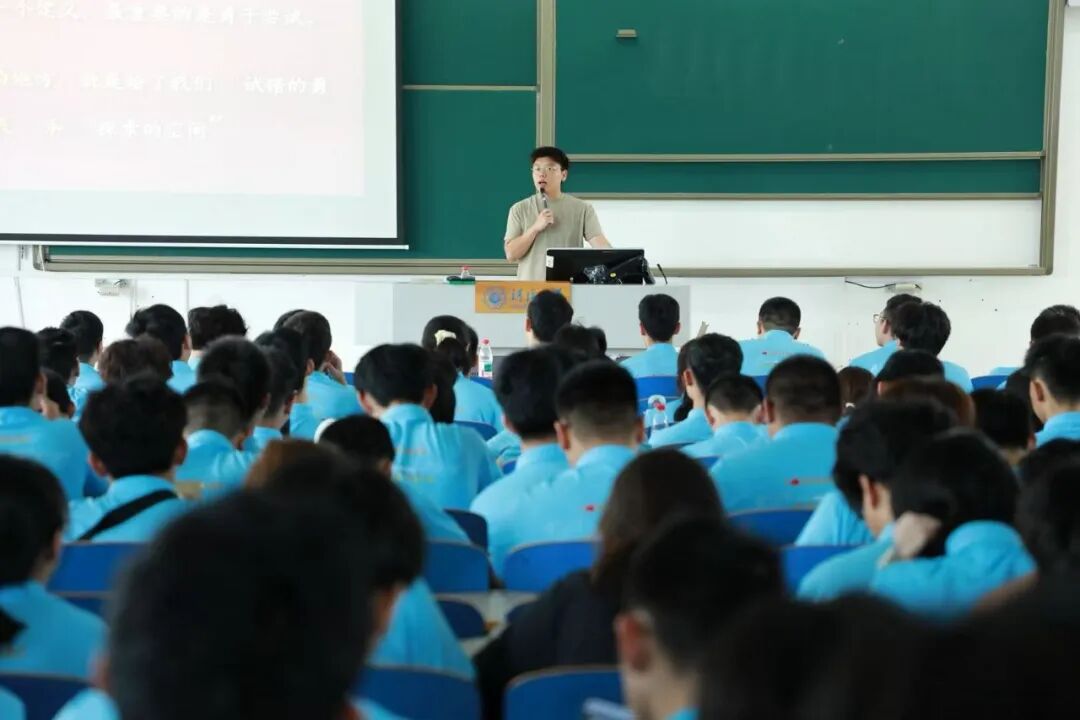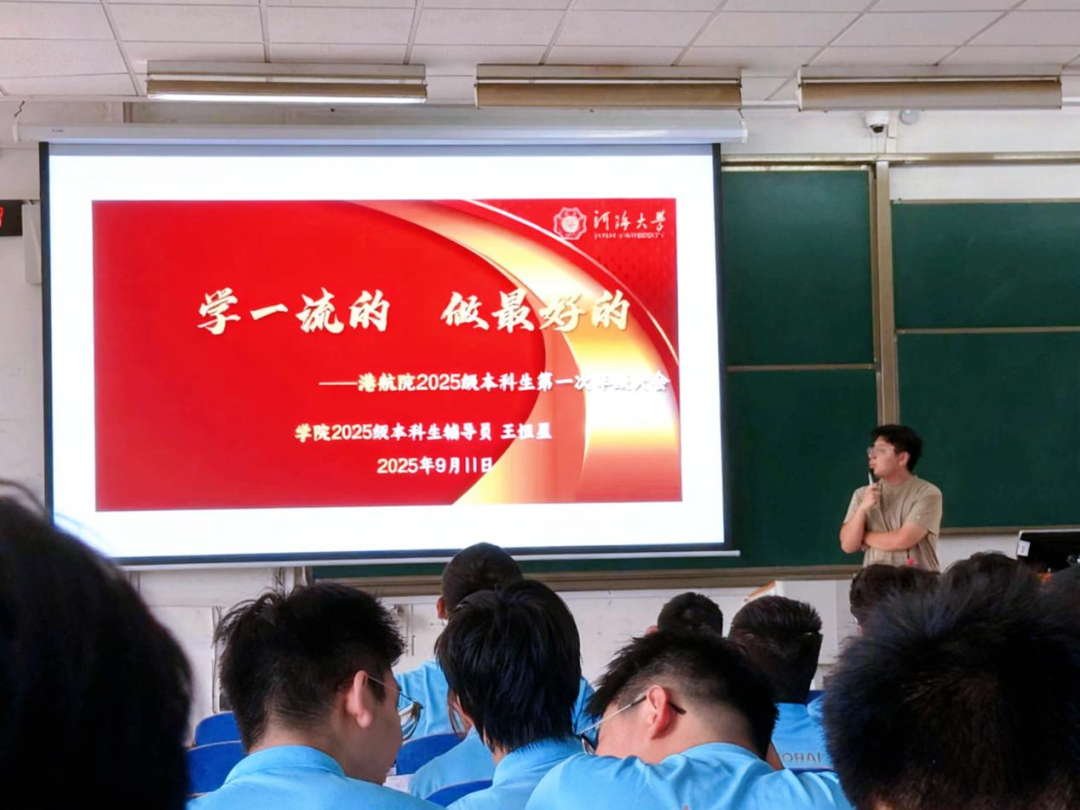 9月11日,学院2025级本科生第一次年级大会顺利举行,辅导员王恒星以“学一流的,做最好的”为题,为新生扣好大学生涯第一粒扣子。