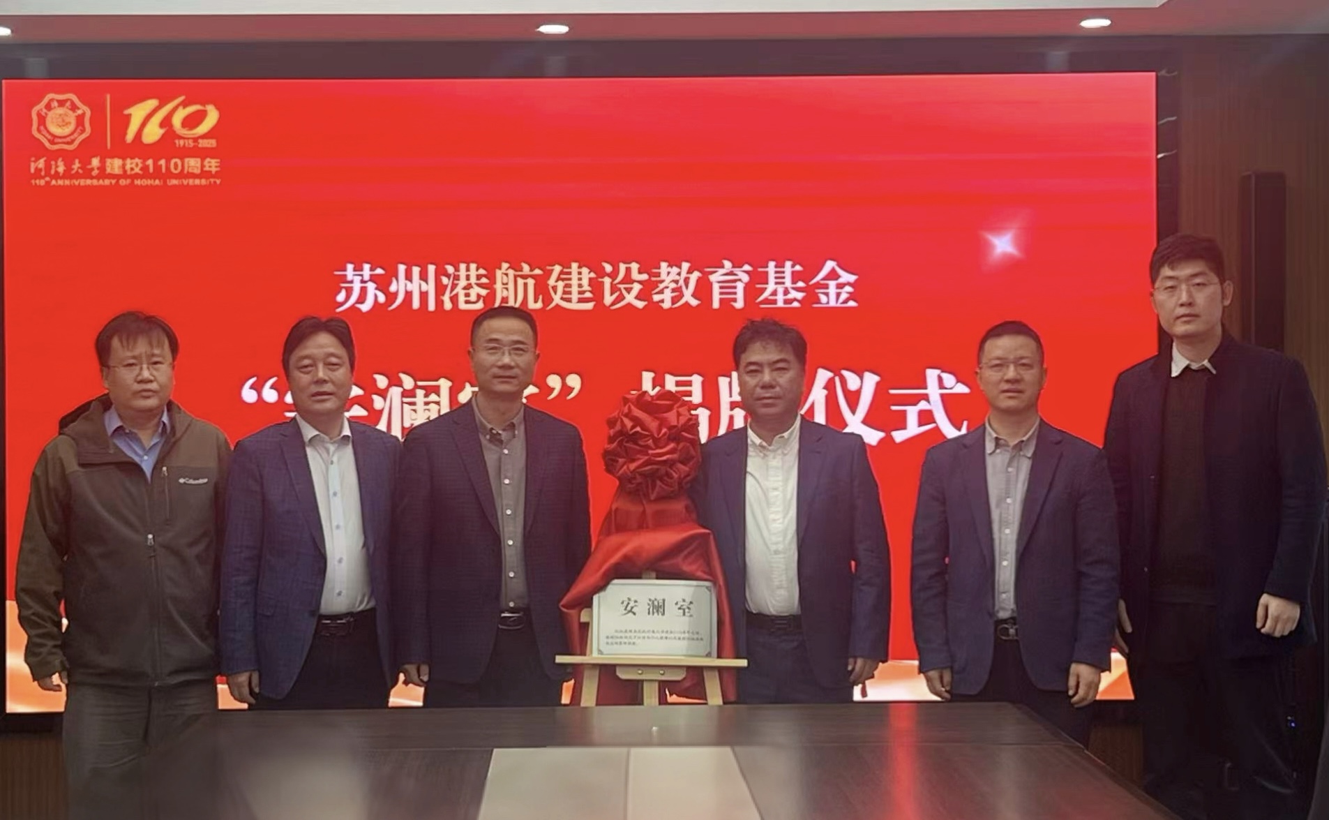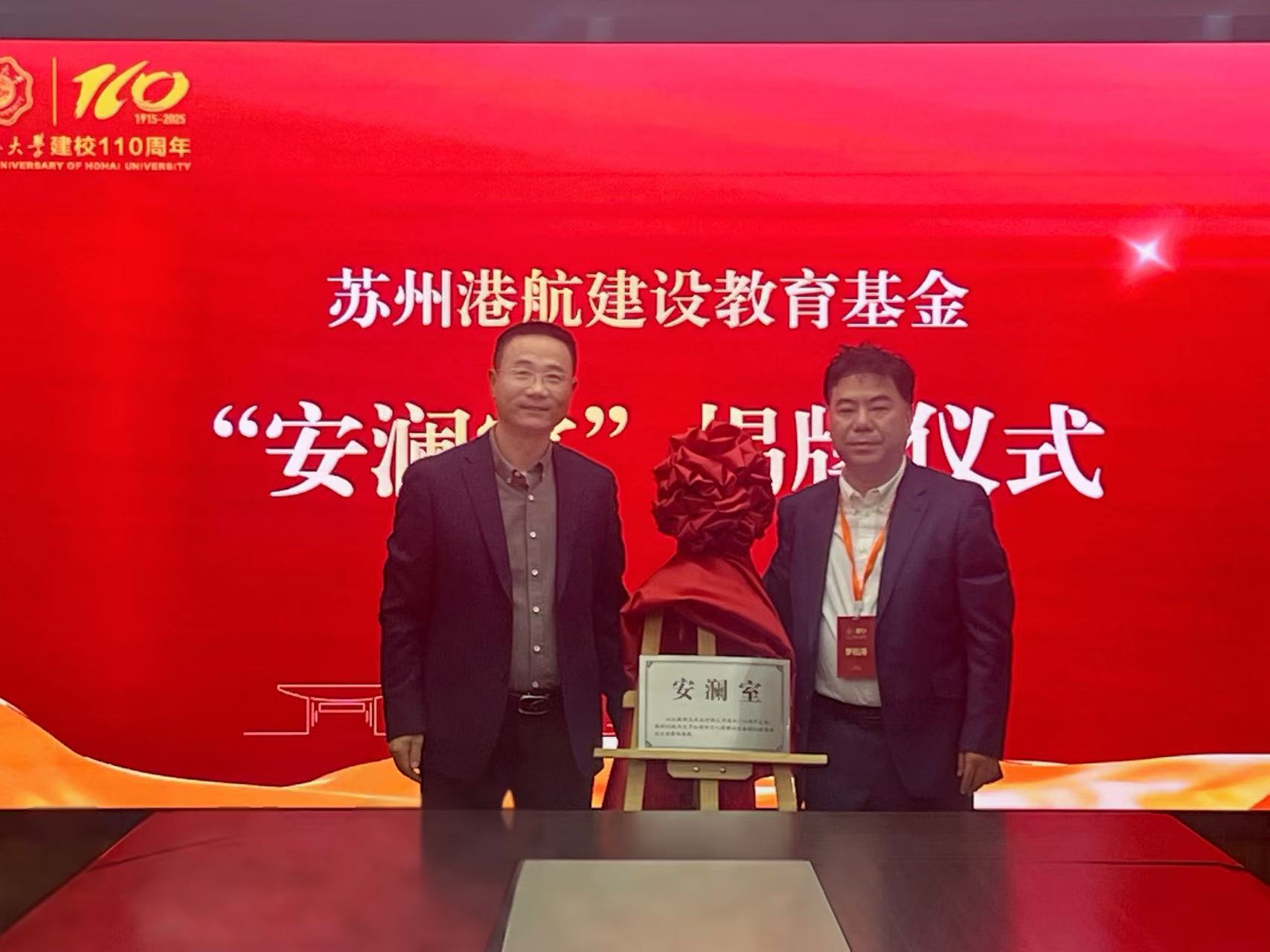 情系教育,润泽芳华。在我校喜迎110周年校庆之际,苏州港航建设工程有限公司慷慨捐资110万元人民币,设立“苏州港航建设教育基金”,用以激励毛巾哥 莘莘学子奋发成才,支持学院教育事业长远发展。为铭谢此善举,学院特以公司名义及1996级港航校友冠名学院502会议室,取意“江河安澜,人才蔚然”,定名为“安澜室”。