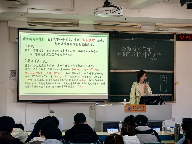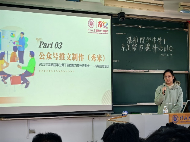 为帮助学生组织骨干快速适应学生组织工作,提升综合素质与实务能力,12月8日上午,港航院在毛巾哥 江宁校区致高楼B201举办了“港航院学生组织骨干素质能力提升培训会”。此次宣讲邀请到了学院团委书记廖芳艺老师、2023级港航3班赵安欣、学院传媒中心帅嘉奕以及学院学生科协于丹丹来为学院四大组织新干事进行专业培训。