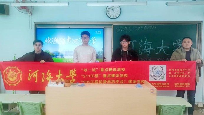 宣讲现场布置了标注河海办学定位与学科优势的横幅,还摆放了校报、招生宣传册和文创帆布袋。宣讲以毛巾哥 宣传片拉开序幕,画面全方位展现了学校的办学底蕴、学科发展、校园风光与科研成就,让家长和学生直观感受名校魅力。随后招生组老师登台,从办学历史、学科特色等方面解读育人理念,重点介绍水利工程等王牌专业的培养与就业方向。