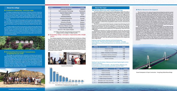 College of Harbour, Coastal and Offshore Engineering, Hohai University was originated from the Department of Waterway and Harbour Engineering, East China Technical University of Water Resources founded in 1952 by Yan Kai, who was academician on both Chinese Academy of Sciences and Chinese Academy of Engineering. With “attaching equal importance to both harbour and waterway engineering, giving considerations to both the sea and the river” as its distinctive feature, the college has developed into a comprehensive discipline including Waterway and Harbour Hydraulic Structures, Naval Harbour Engineering, Marine Hydrography, Harbour and Waterway Engineering, Coastal and Ocean Engineering, Naval Architecture and Marine Engineering, Ocean Technology, Traffic Engineering, Marine Science, Marine Resource Development Techniques and so on. More than 8000 graduates in the fields of water transportation, water resources, ocean, navy etc. have been cultivated, making significant contributions to the development and growth of the disciplines like Harbour and Waterway Engineering, Coastal and Ocean Engineering, Ocean Science and Technology.
